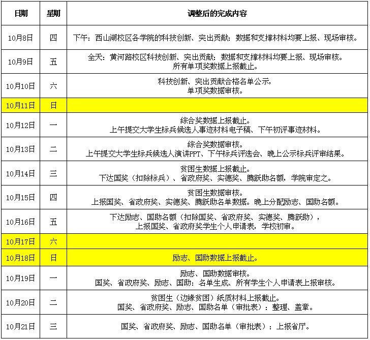 因辽宁省教育厅最近下达的今年我省国家奖学金、省政府奖学金、国家励志奖学金、国家助学金评审材料上报时间提前到10月21日截止(较往年早了10多天),我校的相关工作时间也必须随之调整,请各学院克服困难、提高效率、提早准备,能够保质保量地完成相关工作。