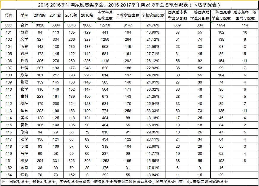 详见附件:《2015-2016学年国家励志奖学金、2016-2017学年国家助学金名额分配表(下达学院表)》 。
