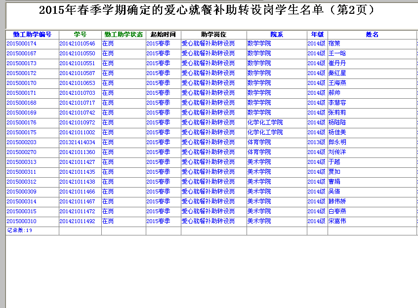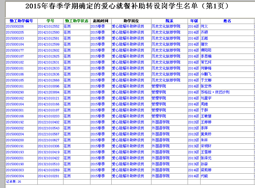 5、“2015年春季学期确定的爱心就餐补助转设岗学生”(附件2-3)的上岗时间同时截止于10月底,如需占用新一轮的“爱心就餐补助转设岗”名额继续上岗,应按今年的转岗名单重新输入数据。