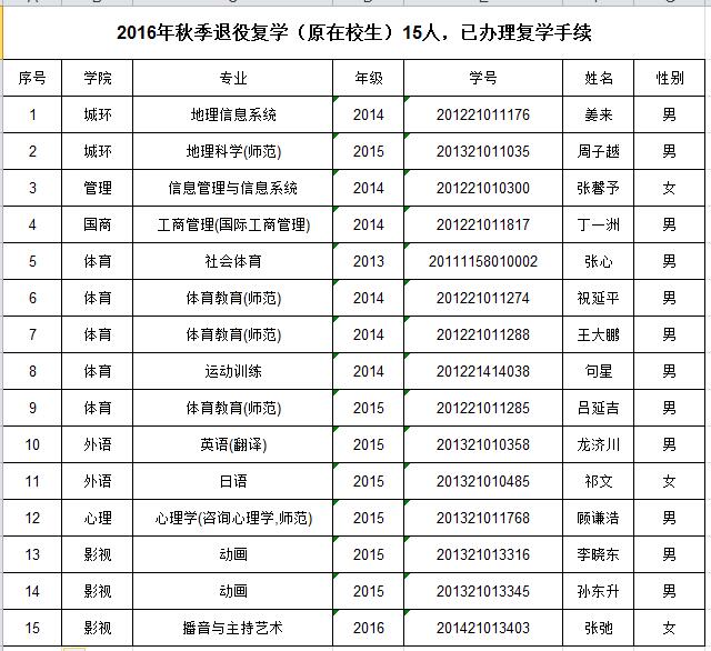 学校掌握的名单共15人(详见附件1),如有遗漏请与学生处联系。
